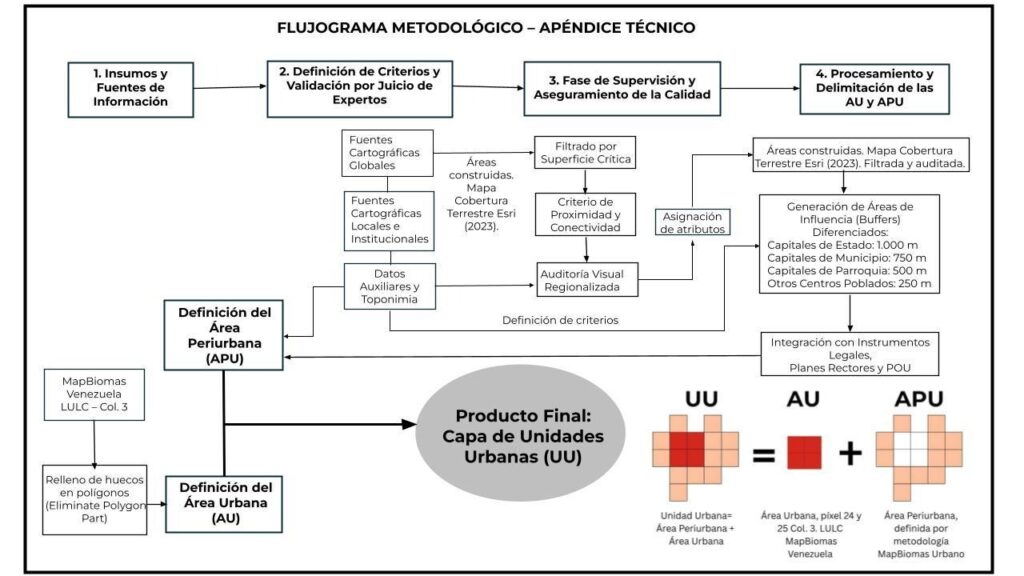 A continuación, se presenta una síntesis de la metodología utilizada para delimitar y caracterizar la dinámica urbana de Venezuela durante el período 1985-2024 en el marco del Módulo Urbano (versión beta). Este módulo permite analizar la expansión urbana y periurbana del país, así como atributos asociados a la vegetación y a la vulnerabilidad frente a distintos factores físicos.